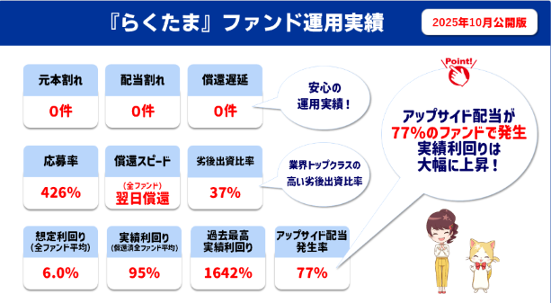 他社では、劣後出資は10%くらいのところが多いけど、らくたまは平均40%まで損失を負担してくれます!