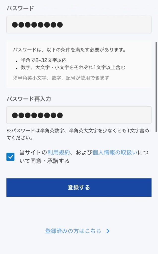 →チェックを入れて、「登録する」をタップしたら、仮登録完了です。